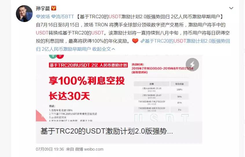 昨天波场CEO孙宇晨也宣布了新的基于TRC20的USDT激励计划,通过空投激励用户将手中的USDT转换成基于TRC20的USDT,持币用户将每日获得空投的利息回报。
