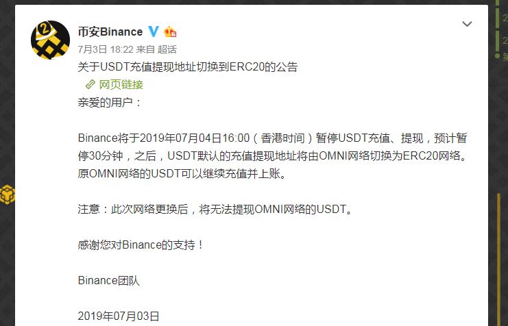 7月3日币安交易所宣布将由OMNI网络切换为ERC20网络,虽然原OMNI网络的USDT可以继续充值并上账,但将无法提现OMNI网络的USDT。这次切换已经在07月04日完成,除了暂停USDT充值、提现的30多分钟外并没有引起什么问题。