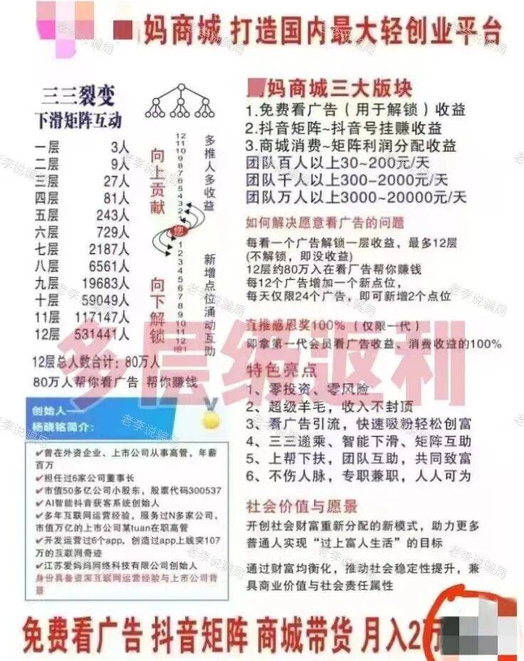 以“免费看广告赚钱、月入2万”为诱饵,靠“三三裂变”发展12层下线。按拉人头的层级发放返利,完全符合“拉人头、层级计酬”的传销核心特征;所谓“零投资零风险”是幌子,参与不仅赚不到钱,还会因发展下线承担法律风险,千万不要相信!