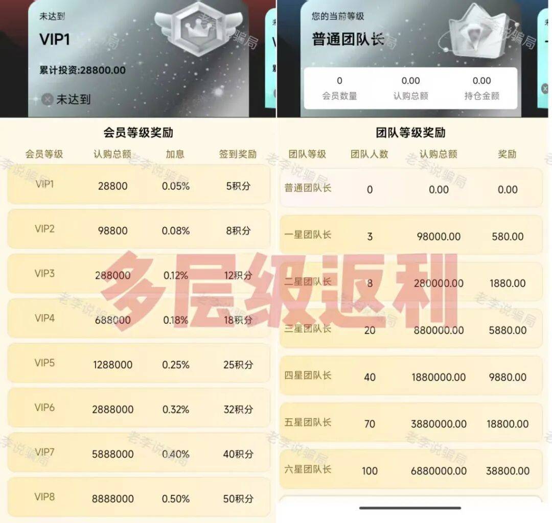 冒充某公司制作虚假APP,兜售虚假的高息理财产品,收益率远超正常投资回报率。根据会员认购总额和团队人数设立多个层级发放动态奖励。