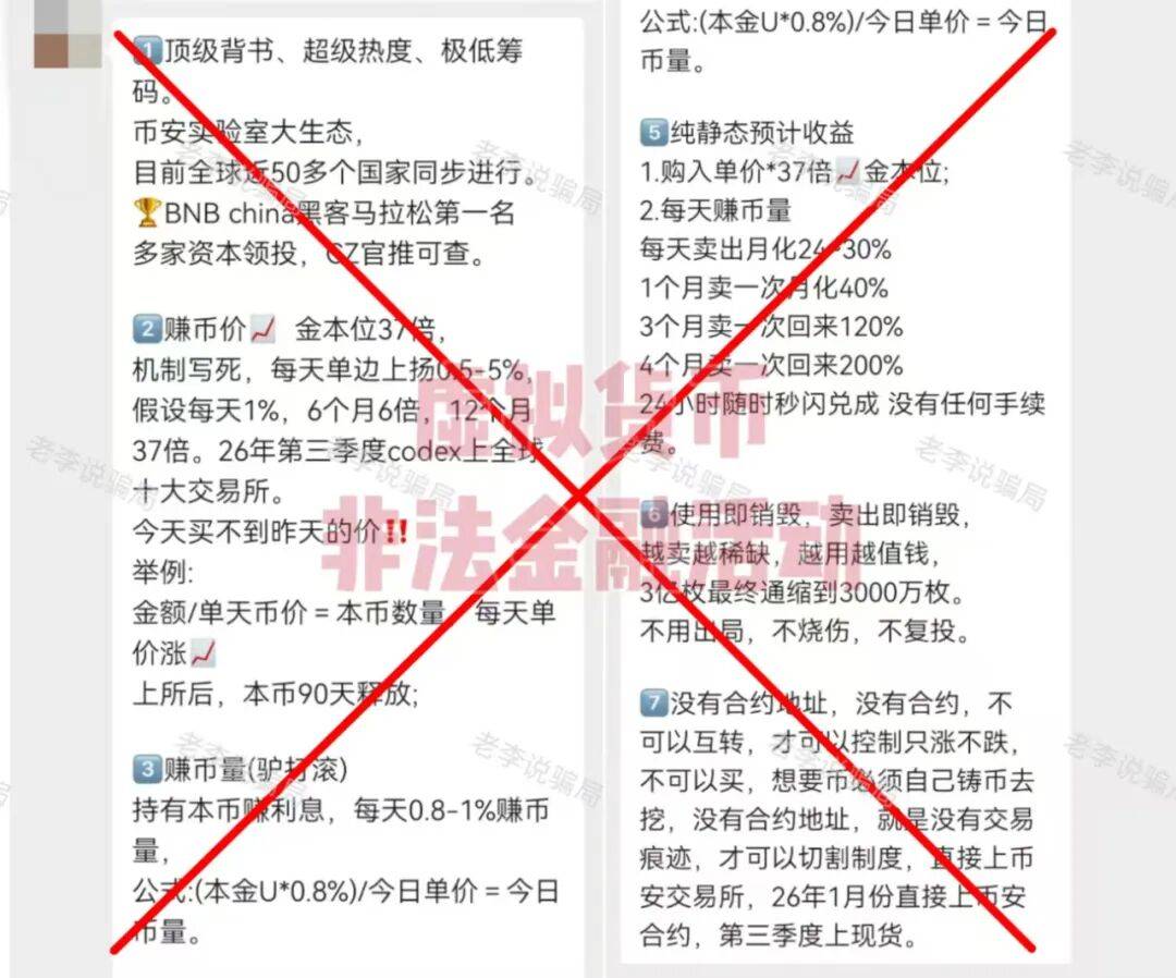 打着“币安背书”的虚拟币骗局。依靠“只涨不跌、月化40%、37倍收益”的虚假高回报为用户画饼,实际是项目方完全操控的空气币;所谓“通缩稀缺”只是包装,本质是靠新资金接盘的资金盘,一旦没新人入场就会跑路割韭菜。