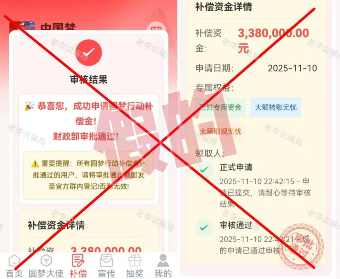 谎称为参与者发放338万补偿金吸引大众。App搭建在境外,前期非法收集个人信息,后期会以各种名义进行收割。