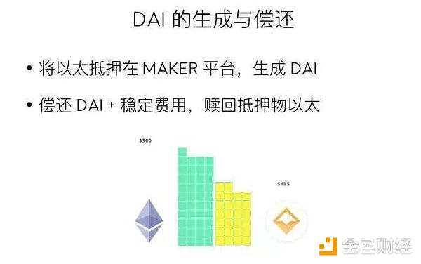 参与者相当于把自己的ETH押在Maker平台,然后平台给予参与者DAI;当参与者想赎回时,除了需要偿还DAI外,还要支付一定的稳定费用,赎回抵押物。