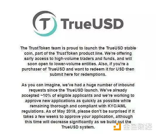 但TrueUSD 强调严格的 KYC(know-your-customer 了解你的客户),一般用户想要将手上的美元1:1兑换成TUSD需要填写详细的表格,并等待数周以上。