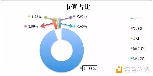 根据区间集最新整理的数据,USDT、TUSD、DAI、bitCNY、bitUSD等主要稳定币在市值、24小时交易量方面,USDT几乎占据着垄断地位,站在稳定币市场的顶端。