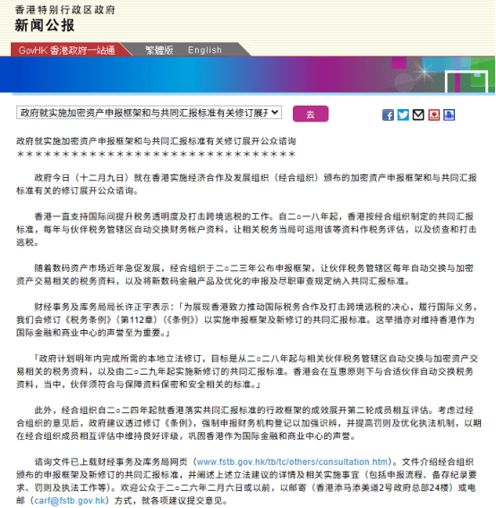 香港政府已于2024年底承诺实施加密资产申报框架,计划在2026年完成本地立法修订,并于2028年起与其他税务管辖区进行加密资产信息自动交换,2029年正式纳入新修订的CRS体系。